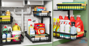 - This under-sink organizer, measuring 11.8″W x 15.9″D x (13.8″-16.9″)H, provides more capacity for storing taller bottles, cleaning supplies, and other essentials.